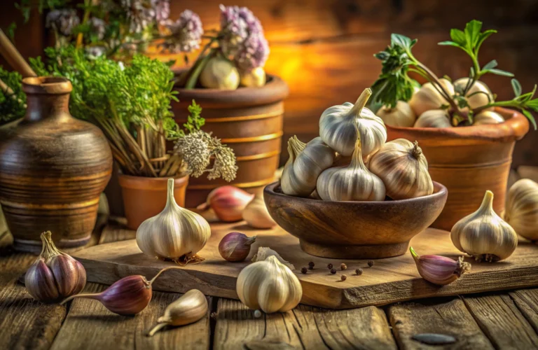 Une photo détaillée de plusieurs têtes d ail fraîches, avec leurs peaux papyracées et leurs gousses bien formées, posées sur un fond de terre cuite évoquant la rusticité et la pureté de la nature